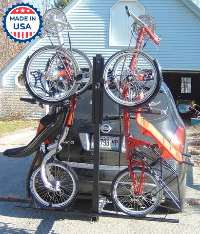 Our Two Trikes Racks for e-trikes or regular trikes hold your trikes vertically. We feel that holding them vertically is better than holding them horizontally because you only have to lift each one up to the bumper level. With our competitor’s horizontal rack you lift one up to bumper level, but the second one you have to lift up to shoulder level.